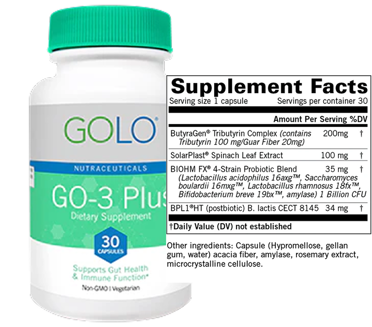 Feed, nourish, and support the balance of healthy bacteria in your gut with GO-3 Plus; a combination of prebiotic, probiotic, and postbiotic ingredients, plus a powerful antioxidant can: