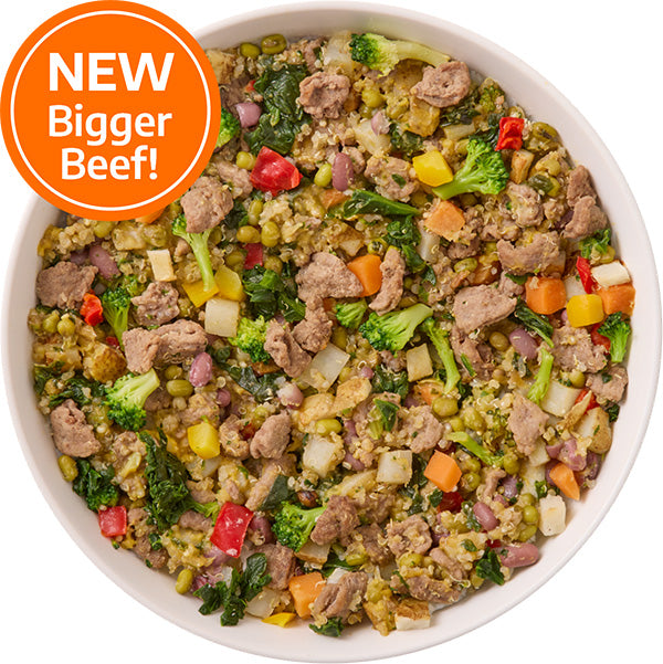 Larger chunks of antibiotic-free beef blended with potatoes, quinoa, vegetables, beans, and seasonings.