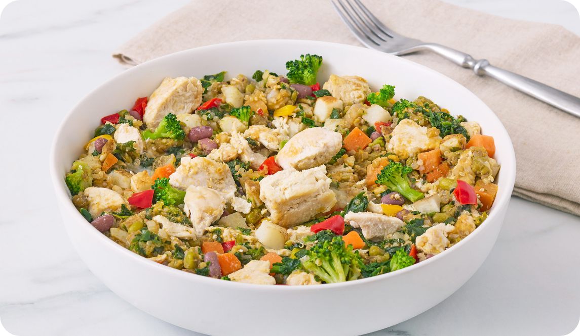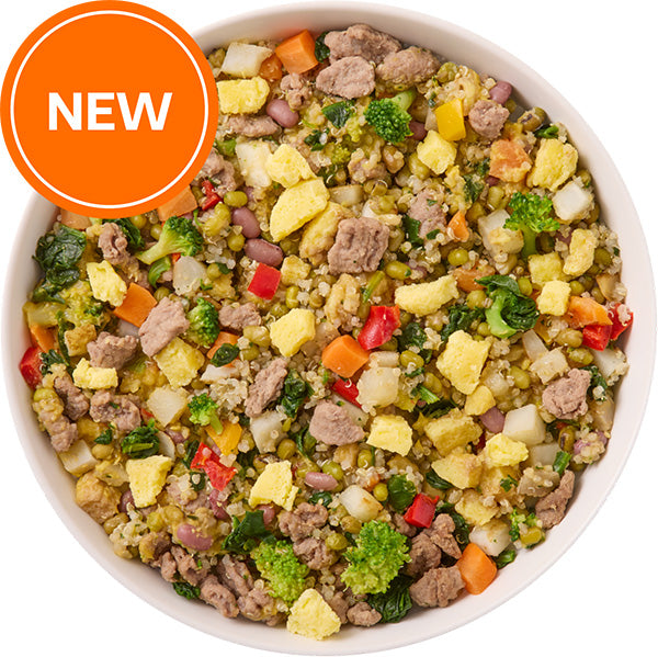 Antibiotic-free beef and cage-free eggs blended with potatoes, quinoa, vegetables, beans, and seasonings.